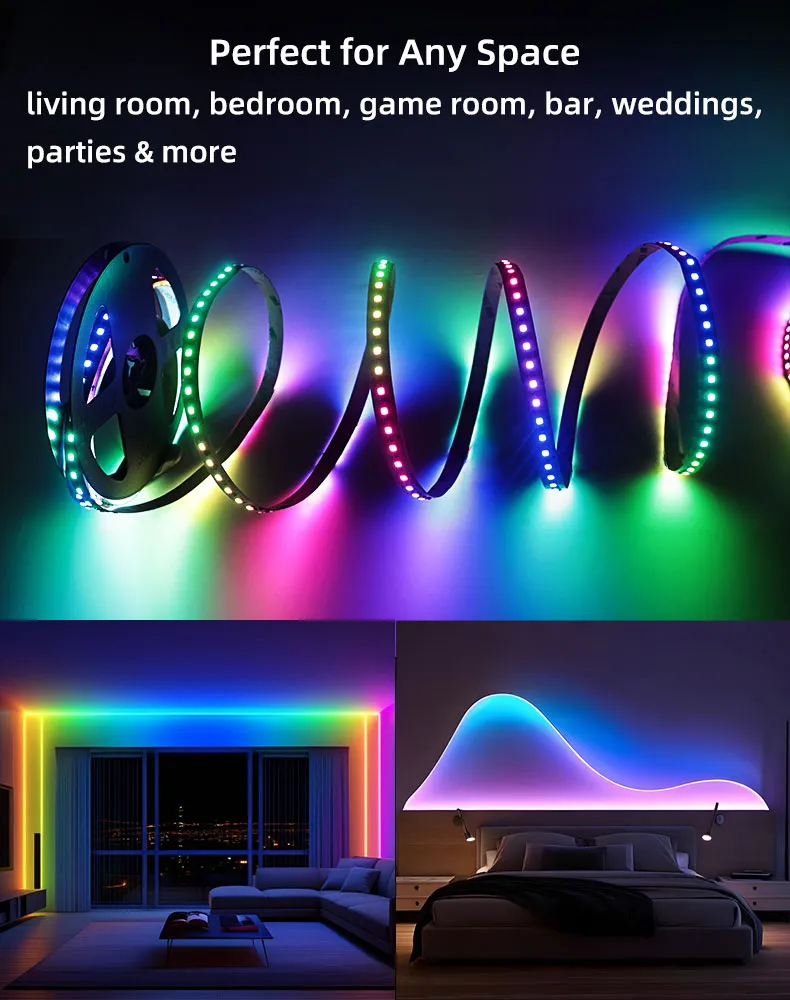 Vibrant RGBIC Effects with 2835 LEDs: Features high-brightness 2835 RGB LEDs with chasing, flowing, strobe, fade, and music sync modes for eye-catching and immersive lighting.
